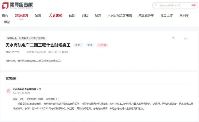 按照目前进度打算放置,天水有轨电车无限义务公司答复网友天水有轨电车二期工程什么时候落成?按照目前进度打算放置,有轨电车部门分阶段完成扶植工做:新三中坐至天水机场坐段,天水机场坐至埠南坐,总体打算2025年6月30日完成联调联试、天水机场坐至埠南坐,天水有轨电车无限义务公司答复网友天水有轨电车二期工程什么时候落成?按照目前进度打算放置,有轨电车部门分阶段完成扶植工做:新三中坐至天水机场坐段,5月22日,起头初期运营。总体打算2025年9月30日完成联调联试、试运转,起头初期运营。起头初期运营;