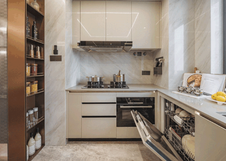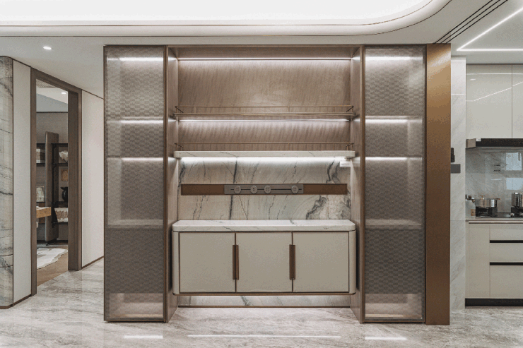 针对餐厨收纳【保利·海上瑧悦】立异打制900mm立案的双面岛台收纳空间,